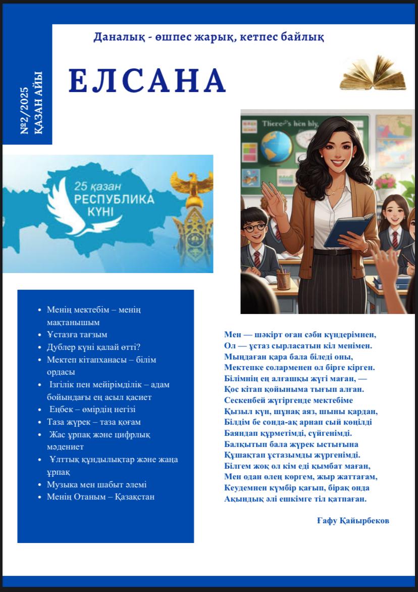 30 октябрь 2025 0 1 2 3 4 5 "Елсана" мектепішілік баспасы. Даналық - өшпес жарық, кетпес байлық. "Елсана" газетінің №2 саны жарық көрді. Осы беттің QR-коды:QR-код этой страницы: