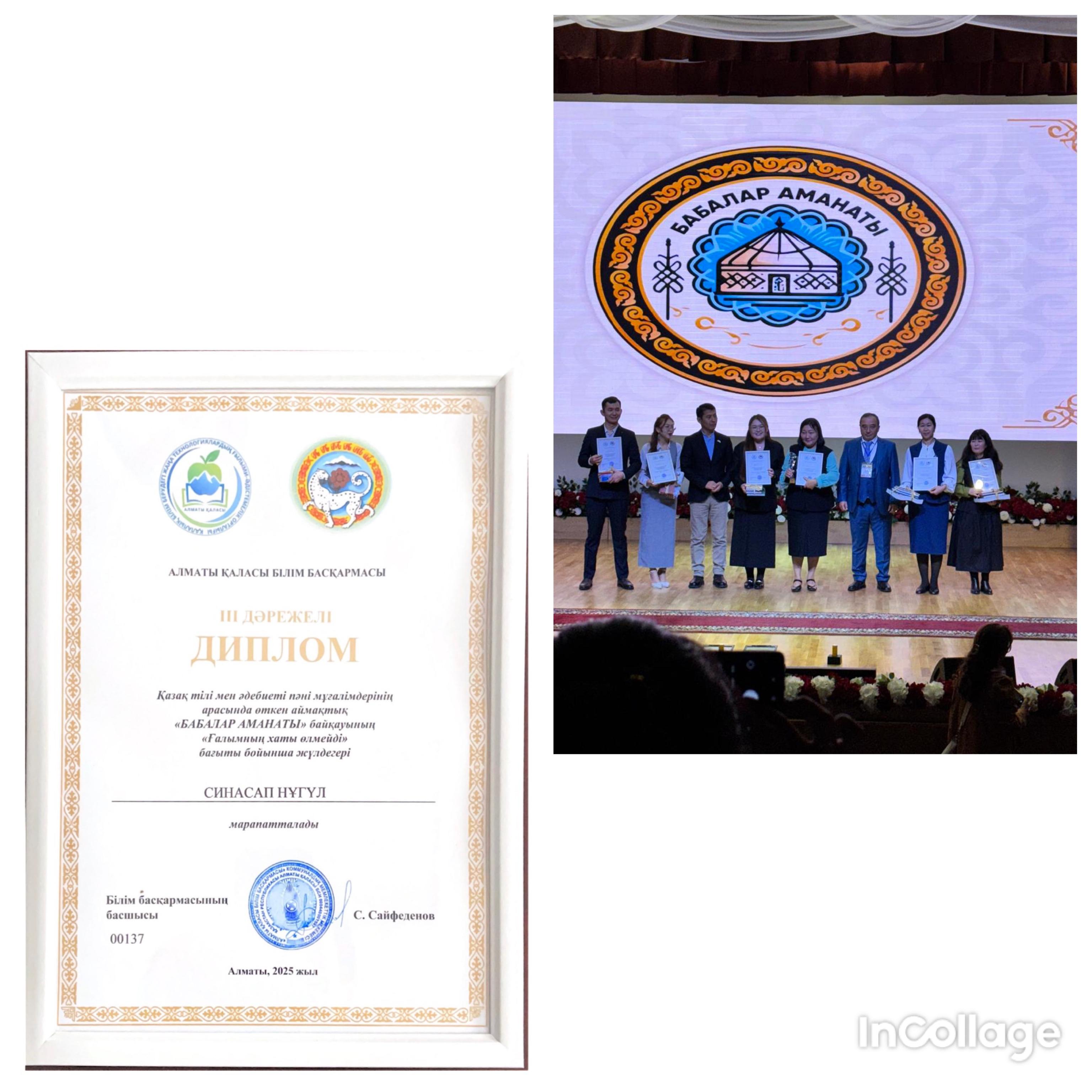 Қазақ тілі мен әдебиеті пәні мұғалімдерінің арасында өткен аймақтық «Бабалар аманаты» байқауында мектебіміздің абыройын асқақтатқан Синасап Нұргүл «Ғалымның хаты өлмейді» бағыты бойынша III дәрежелі дипломмен марапатталды.