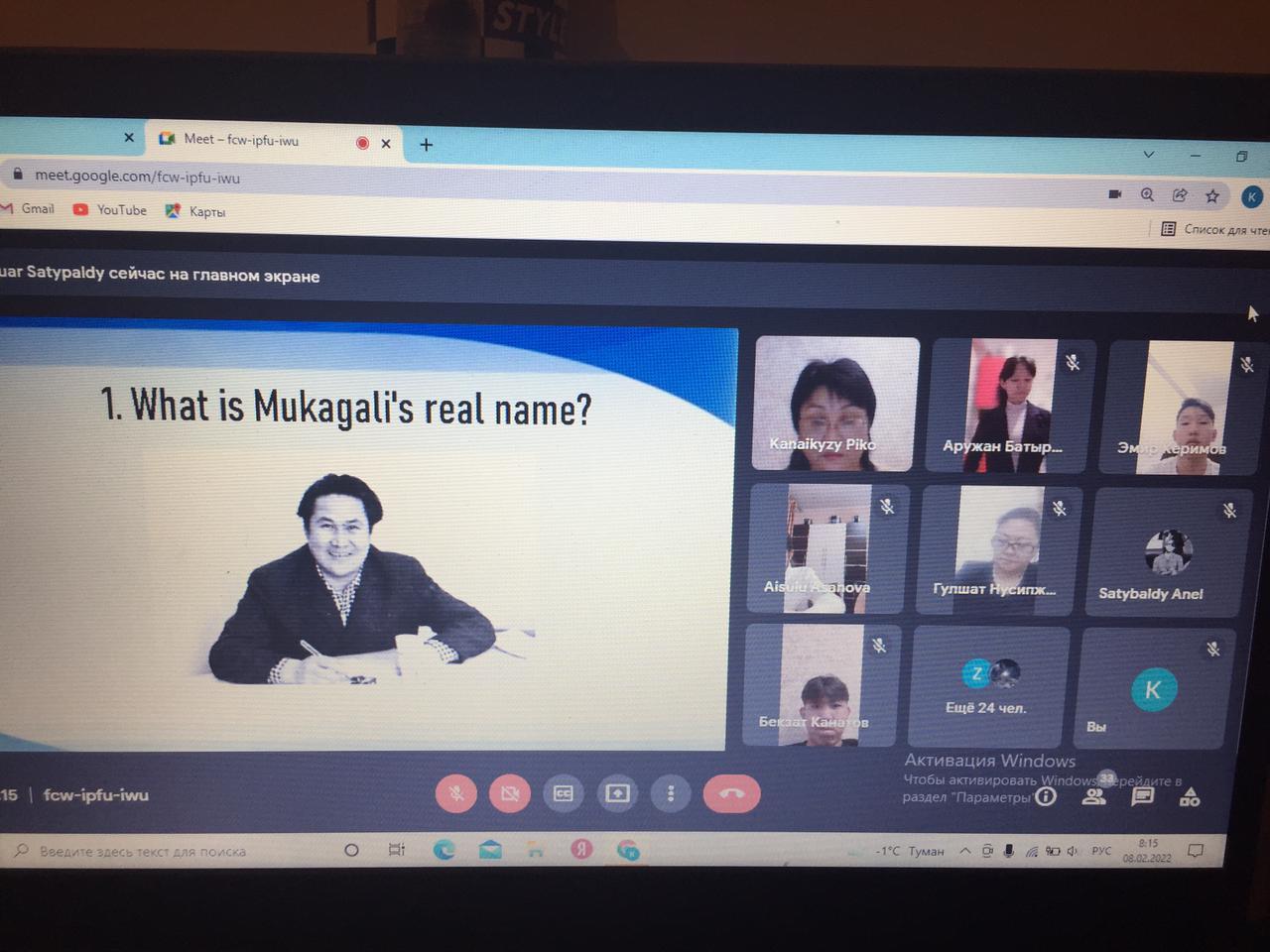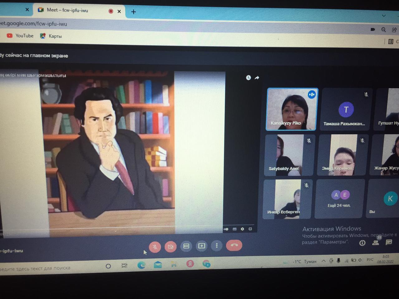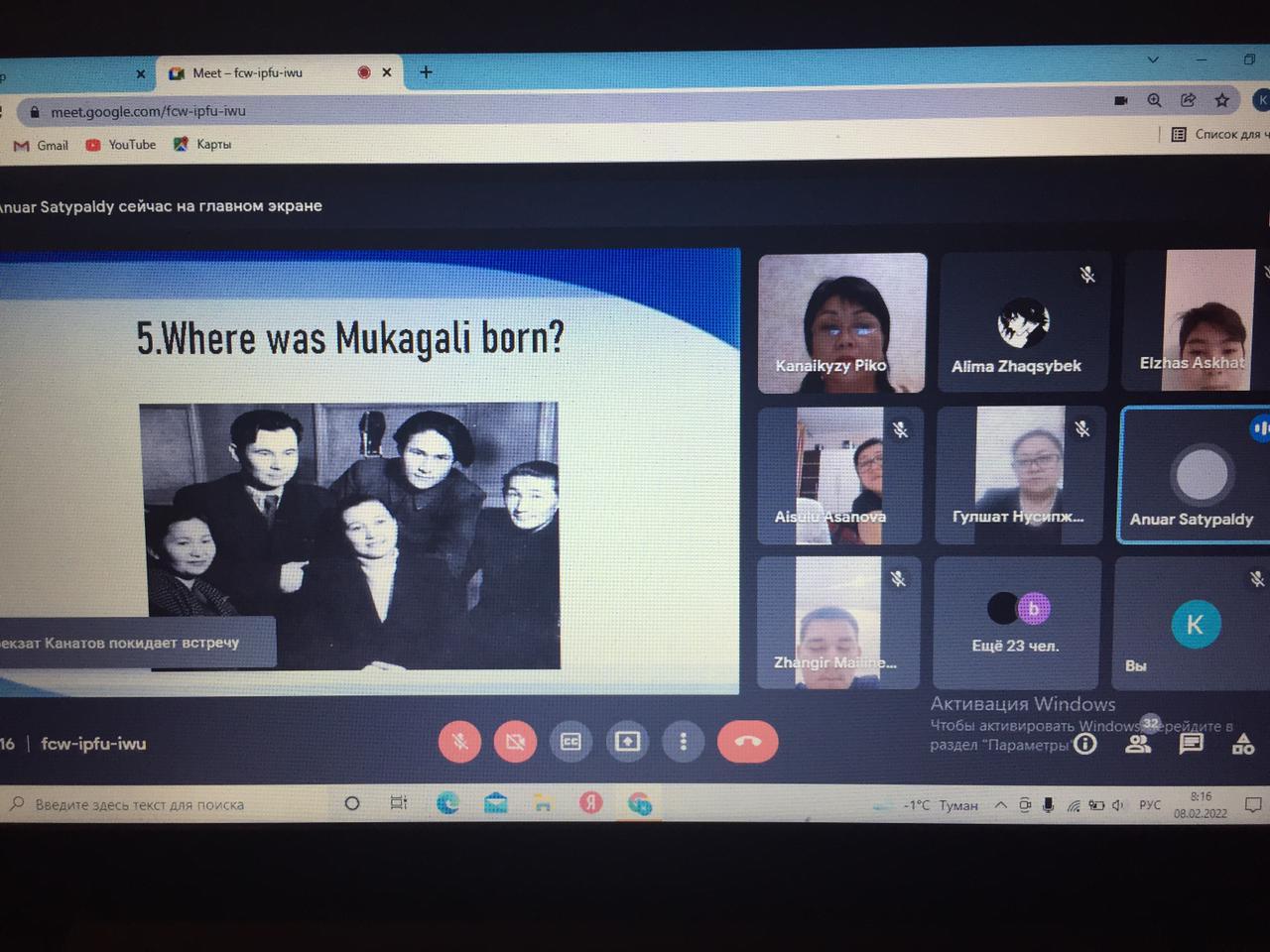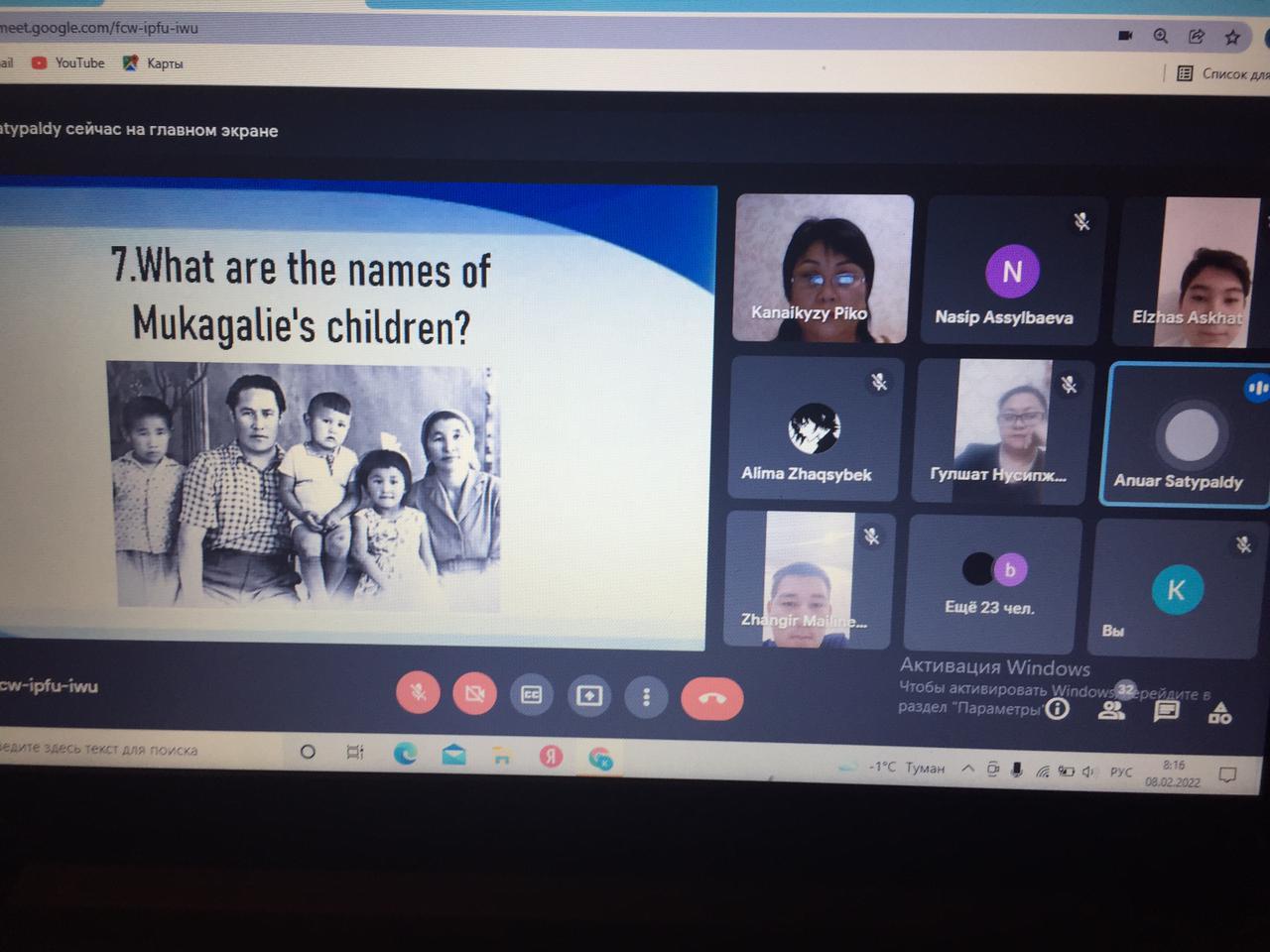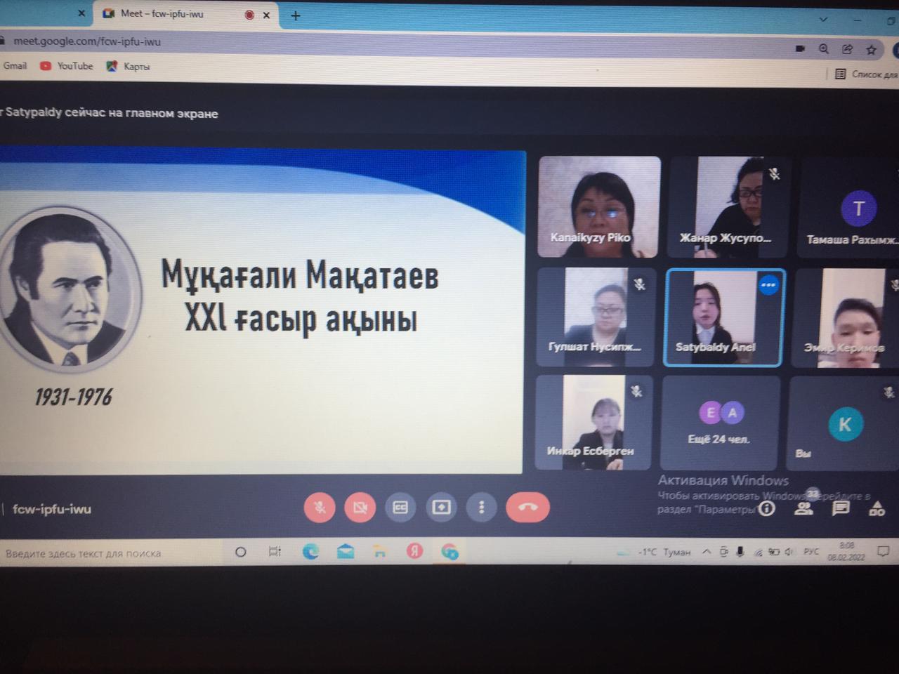 Мұқағали Мақатаевтың туған күніне орай ақынның өмір жолымен, шығармашылығымен оқушыларды таныстыру, ғасыр ақыны Мұқағалидың жырларын насихаттау, ақын өлеңдерінің мәңгілік жыр қазына екендігін ұғындыра отырып оқушыларды өлеңді мәнерлеп, нақышына келтіріп оқуға дағдыландыру мақсатында "М.Мақатаев-ХХІ ғасыр ақыны" тақырыбында 8 "А" сыныбында ашық тәрбие сағаты өткізілді. Ашық сабақ өте әсерлі, мәнді мағыналы өтті. Оқушылардың үш тілде ойларын ашық еркін жеткізе білуі, ата-аналармен бірлесе шырқалған әндер көрермендердің көңілінен шығып, ризашылықтарын білдірді. Сынып жетекшісі Ғ.Оразова.