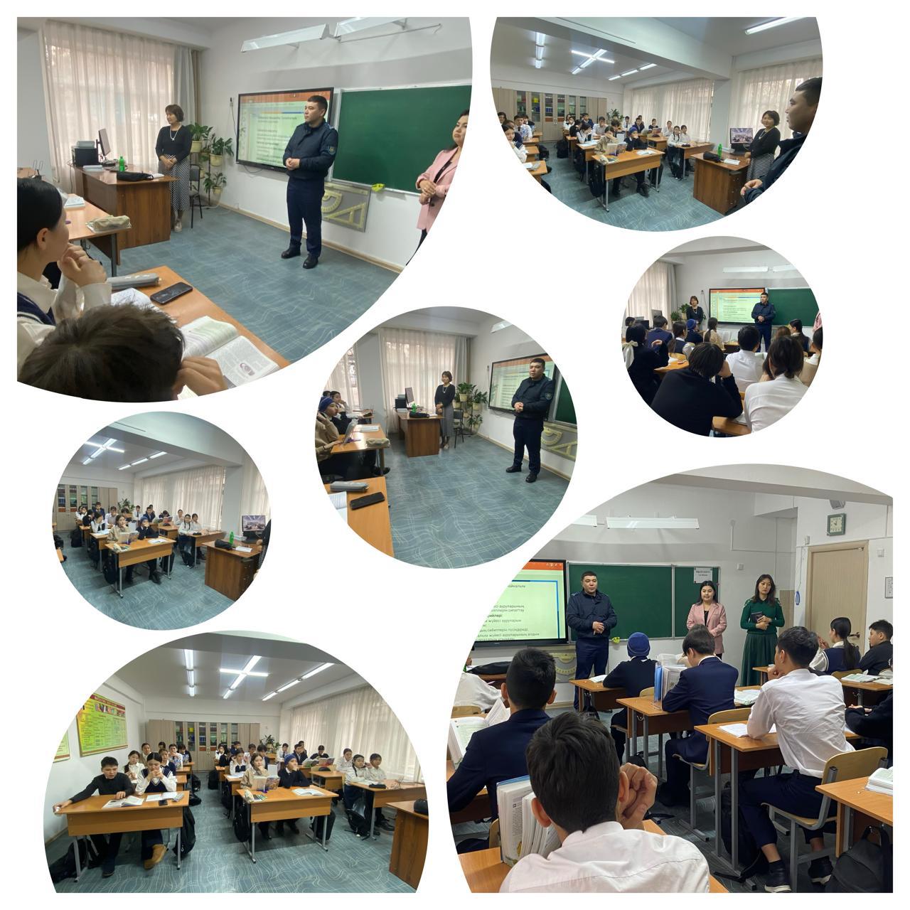 ұйымдастырды.Қазіргі қоғамдағы ең маңызды мәселелерінің бірі – бұл жасөспірімдердің арасындағы құқық бұзушылық пен қылмыстың көбеюі. Осындай жағдайлардың алдын алу үшін балаларымыздың бойында дұрыс құқықтық тәрбие мен құқықтық білім беруіміз керек. Құқық пен тәрбиенің өзара байланысты әрекеті негізінен тәрбиеге араласқан ата-- аналар мен ұстаздар арқылы іске асырылады.Сонымен қатар, әлеуметтік желілердегі таныстықтың зардаптарының алдын алу туралы, жолда жүру ережелері туралы оқушыларға толық ақпарат берілді.