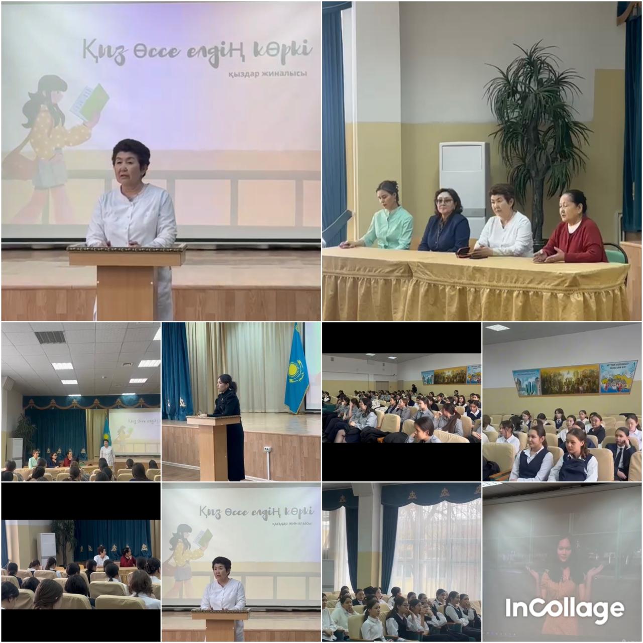 Мектеп-гимназиямызда 5-11 сынып оқушылары арасында қыздар жиналысы өтті. Жиналысқа №4 қалалық емханадан терапевт Э.Б.Аппарбекова, психолог Ж.Т.Эргашева, қыздардың тәртібі,жеке бас тазалығы (гигиена) туралы сөз қозғалды. Жиналысқа Т.М.Айтмухаметова, Ж.Хусаинова асыл әжелерімізде қатысты. Қыздарымызға кешкі уақытта қыдырмау,өзін дұрыс ұстау, ерсі қылықтар жасамау керектігін айтып өтті. Қыз баланы тәрбиелеу-ұлтты тәрбиелеу. Қыз балалар арасында жат қылықтардың алдын алу жұмыстарын күшейте отырып, қоғам назарын қыз тәрбиесіне арнауда ақпарат беру мақсатында өткізілген жиналыста еркін пікір алмасу болып, кері байланыс жүргізді.