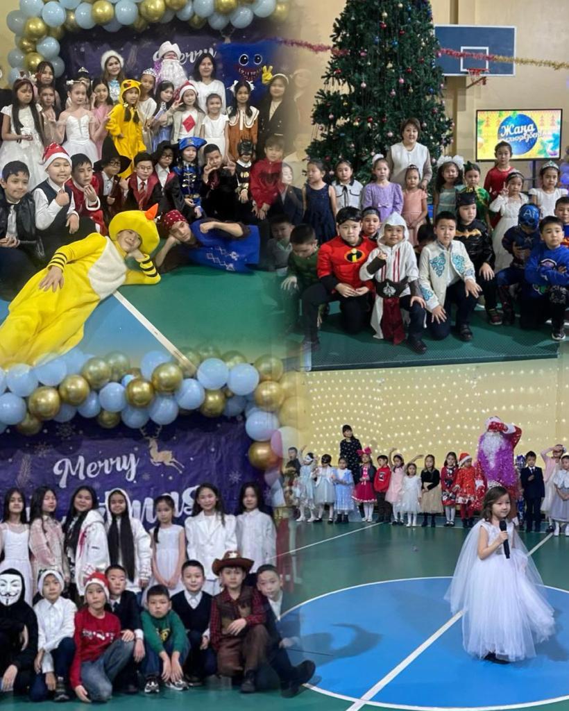 1-4 сыныптарда "Қош келдің жаңа жыл!" тақырыбында мерекелік кеш өтті. Мақсаты: оқушыларға мерекелік көңіл күй тудыру, шыршаның қалай әдемі де сәнді безендірілгеніне балалардың, Аяз атаның, ақшақардың, кейіпкерлердің карнавалдық киімдеріне назар аударту, көңілді ойындар ойнату, достық қарым - қатынас ояту, аудиторияға мерекелік көңіл күй жасау.