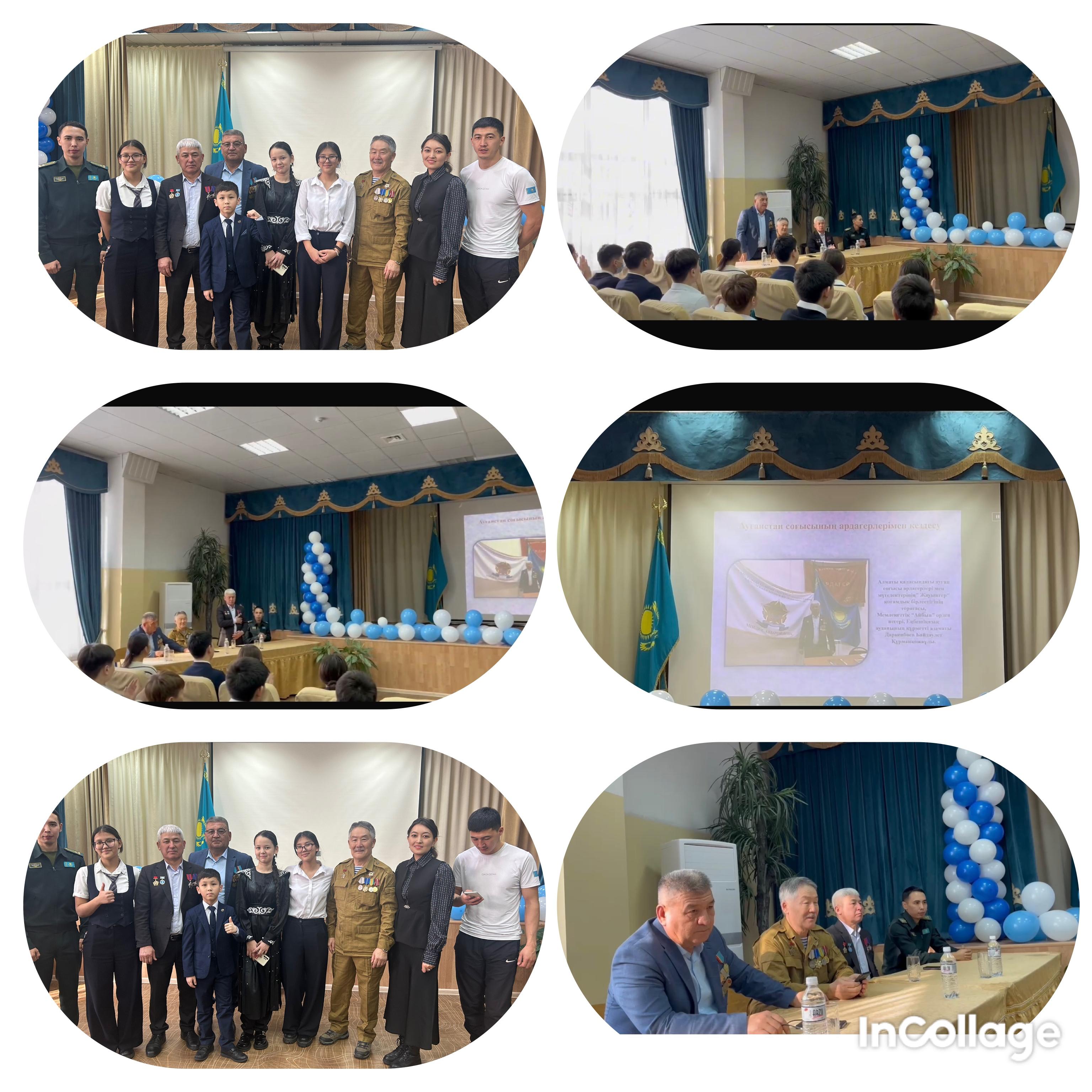 Кеңес әскерінің Ауған жерінен шығарылуының 36 жылдығына орай Ауған соғысы ардагерлерімен кездесу кеші ұйымдастырылды.Іс-шараға ардагерлеріміз : Даркенбаев Б.Қ, Құнанбай.Ж.Қ,Жорабаев А.А. шақырылды.Ардагерлеріміз Ауған жерінде болған сұм соғыстың қиын-қыстау кезеңдері мен естеліктерін баяндады.Мектептің алғашқы әскери дайындық жетекшісі Бағдаулетов Бауыржан жоғарғы сынып оқушыларына жастарды өз Отанын сүюге, жаудан қорғауға, өз елінің патриоты болуға шақырды. Кездесу оқушылардың жыр-тақпақтарымен ұласты, жанды дауыста патриоттық әскери әндермен шашу шашты.Бұл кездесу оқушыларға ешқашан ұмытылмастай тамаша әсер қалдырды.