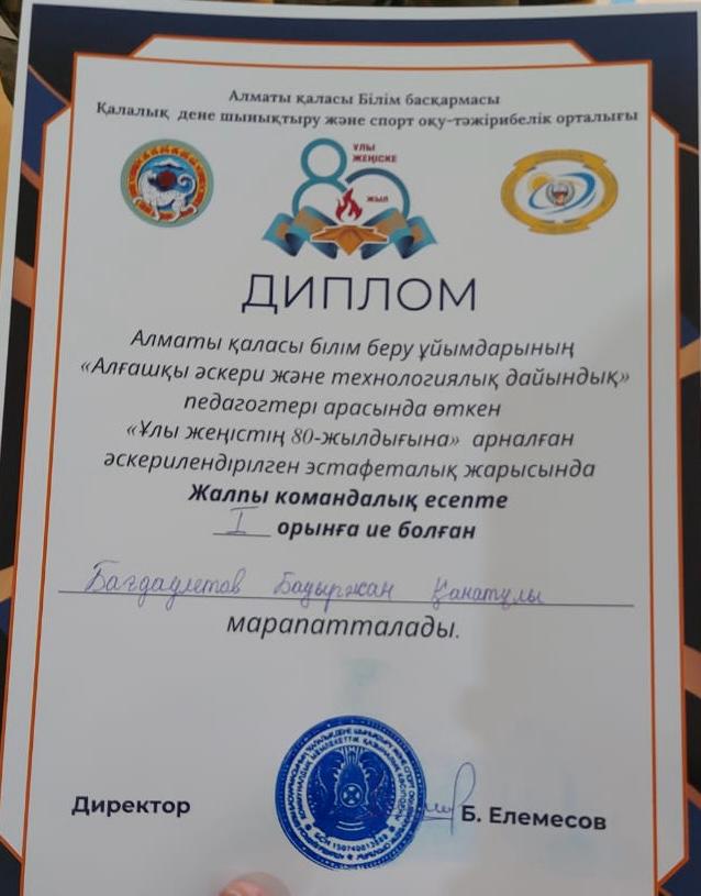 Алматы қаласы білім беру ұйымдарының «Алғашқы әскери және технологиялық дайындық» пәні мұғалімдері арасында өткен, Ұлы Жеңістің 80 жылдығына арналған әскерилендірілген эстафеталық жарыста 1-орын иеленген алғашқы әскери дайындық пәнінің мұғалімі Бағдаулетов Бауыржан Қанатұлын шын жүректен құттықтаймыз!