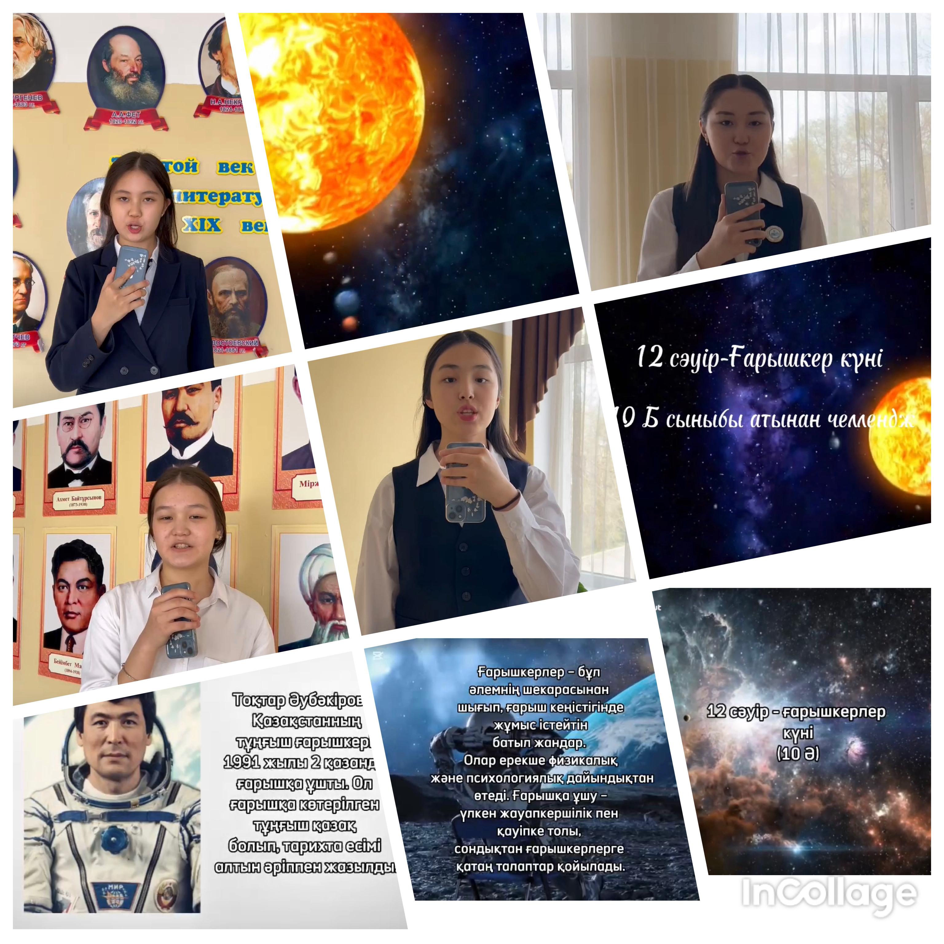 Осы Әлемдік даталы күнге арнап 10 сынып оқушыларымыз видеочеллендж ұйымдастырылды. Қазақстанда космос кеңістігін зерттеу туралы жазылған ғылыми еңбектер, еліміздің ғарышкер-ұшқыштары, халық батырлары Т.Әубәкіров, Т.Мұсабаев және А.Айымбетовтердің өмірі, қызметтері және космос кеңістігін бағындырудағы жасаған ерліктері туралы қысқаша видео жолдады.