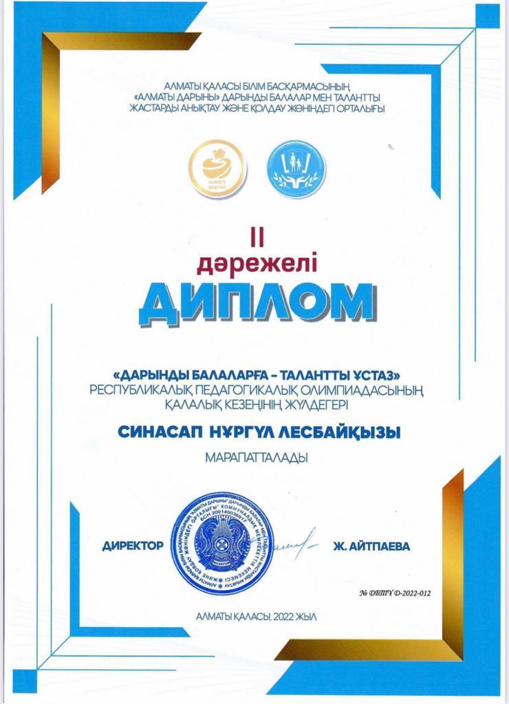 “Дарынды балаға - талантты ұстаз” республикалық педагогикалық олимпиадасының қалалық кезеңінен мектеп-гимназия психологы Қуанышбай А- 1 орын, тәлімгер, қазақ тілі және әдебиеті пәнінің мұғалімі Синасап Н-2 орын иеленді. Құттықтаймыз! Еңбектеріңіз арқашан жемісті болсын!