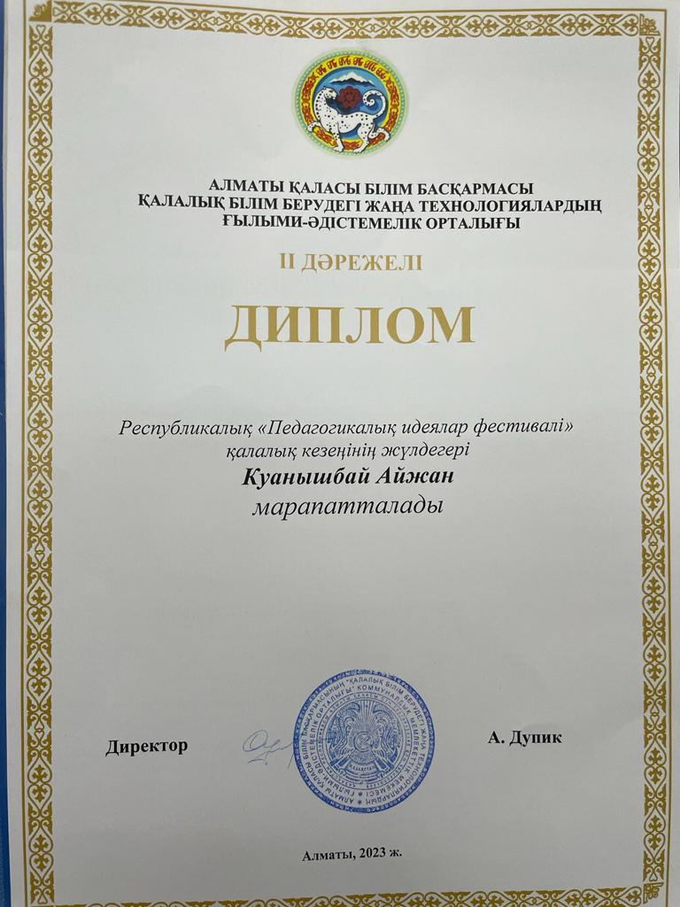 Алматы қаласы Білім басқармасының "Алматы дарыны" дарынды балалар мен талантты жастарды анықтау және қолдау жөніндегі орталығының ұйымдастыруымен өткен Республикалық "Педагогикалық идеялар" фестивалінің қалалық кезеңіне мектеп-гимназия психологы Қуанышбай Айжан Ғаниқызы қатысып, жүлделі ІІ дәрежелі дипломмен марапатталды.