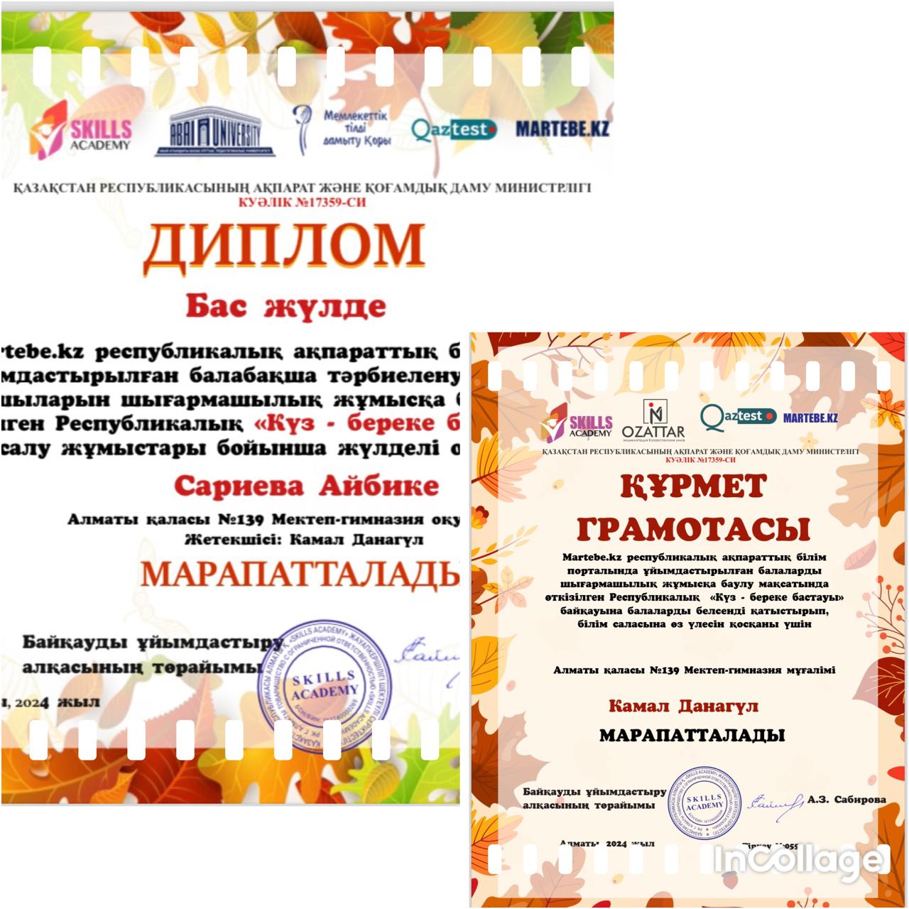 "Martebe.kz" республикалық ақпараттық білім порталында ұйымдастырылған мектеп оқушыларын шығармашылық жұмысқа баулу мақсатында өткізілген Республикалық "Күз-береке бастауы" байқауында сурет салу жұмыстары бойынша жүлделі орын иеленгені үшін Сариева Айбике БАС ЖҮЛДЕ мен марапатталды.Жет