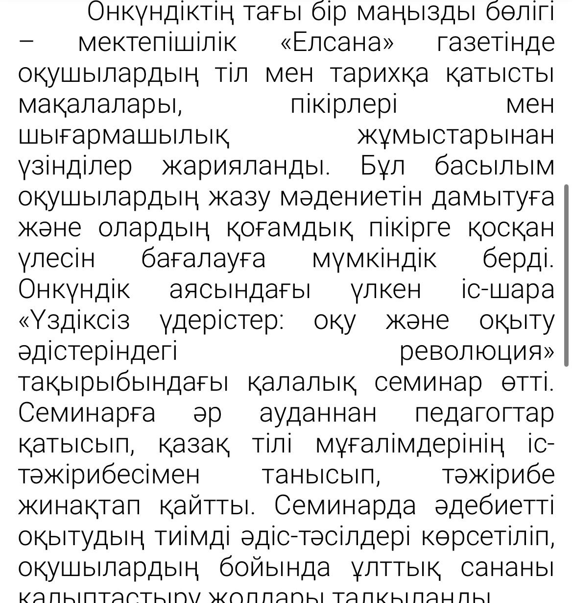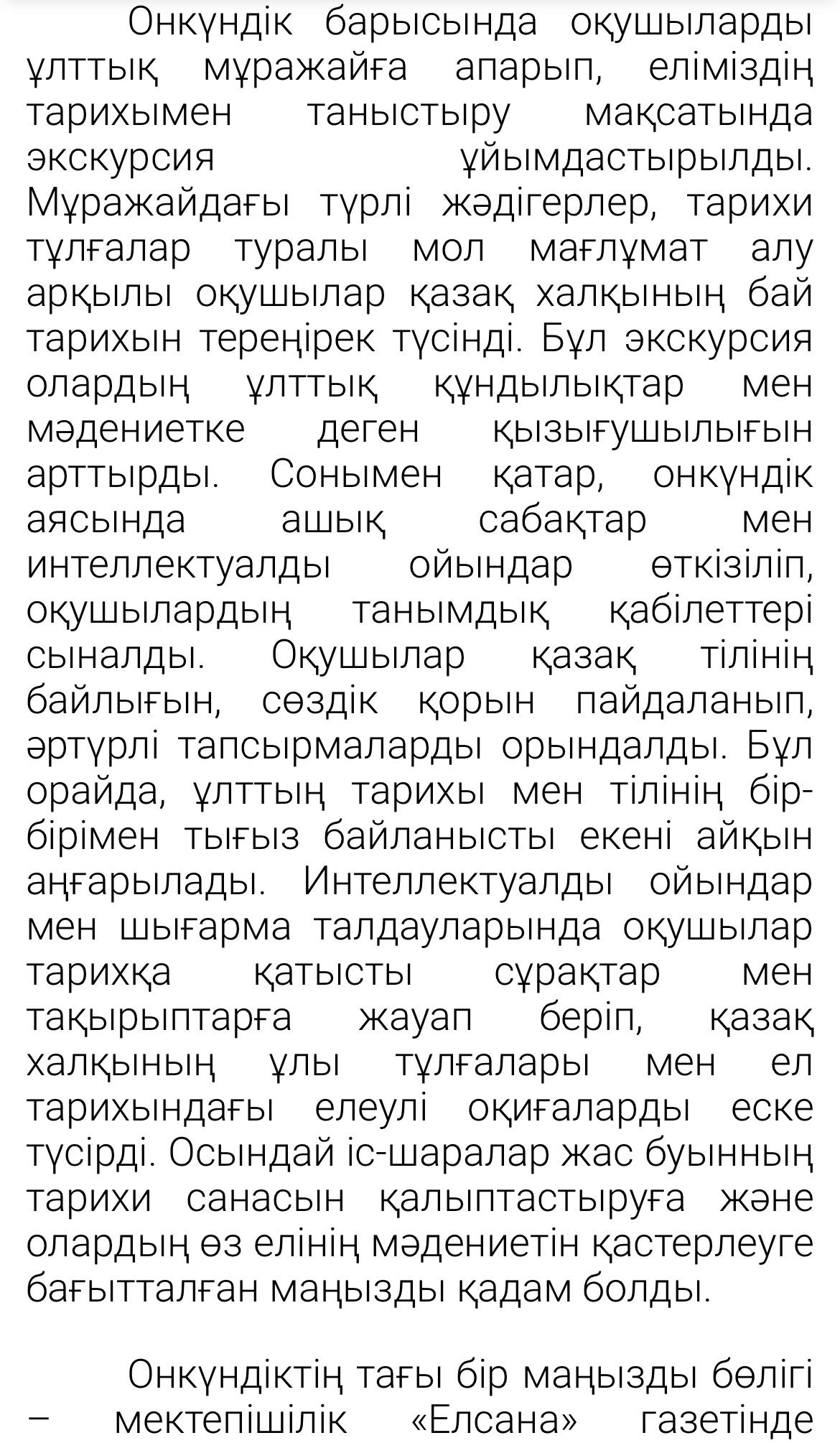 06 февраль 2025 0 1 2 3 4 5 "Ақшам" газеті Қазақ тілі мен әдебиеті пәнінің мұғалімі Рахымжанова Тамаша Бериковна "Тәуелсіз елдің тірегі-тіл мен тарих" атты мақаласы Ақшам газетіне жарияланды. Осы беттің QR-коды:QR-код этой страницы: