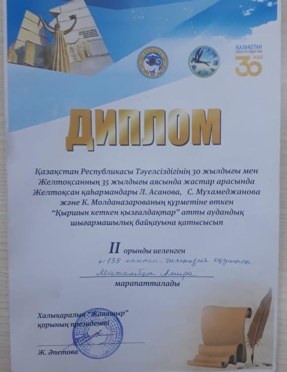 139 мектеп » Оқушыларға » Тәуелсіздіктің 30 жылдығына орай "Патриоттық рух-басты құндылық" атты аудандық байқау нәтижесі