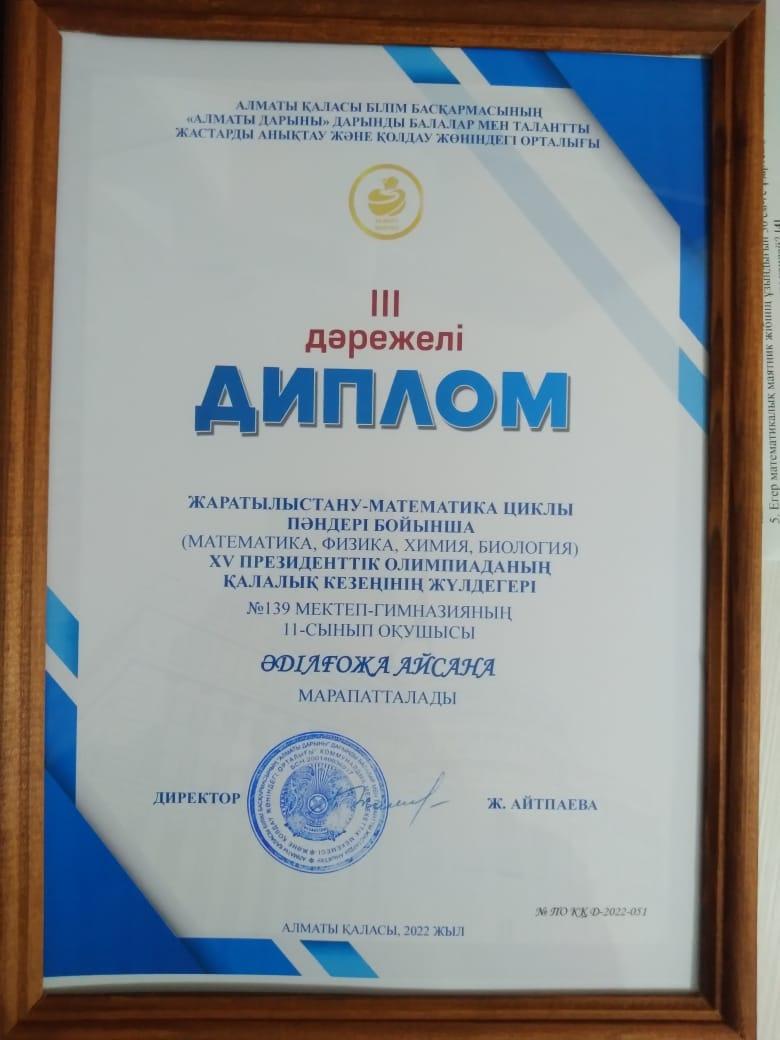 Жаратылыстану-математика циклы пәндері бойынша (математика,физика, химия, биология) өткен ХV президенттік олимпиаданың қалалық кезеңінен №139 мектеп-гимназияның 11”Ә” сынып оқушысы Әділғожа Айсана III дәрежелі дипломмен марапатталды! Ардайым биік шыңдардан көріне беруіңе тілектеспіз! Болашағың жарқын, алар асуларың көп болсын! Жеңісің құтты болсын!